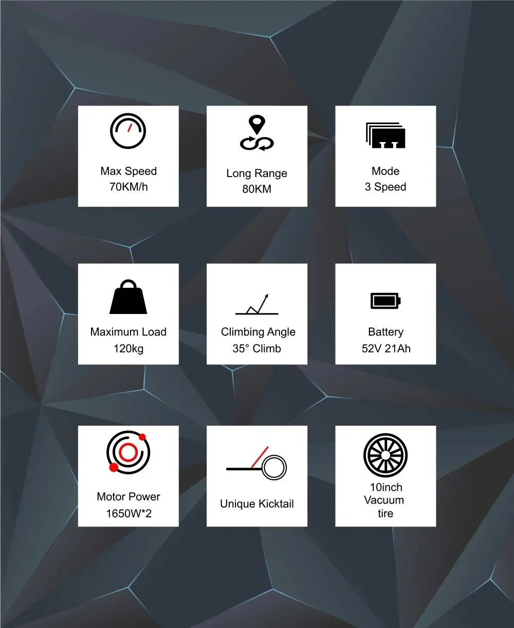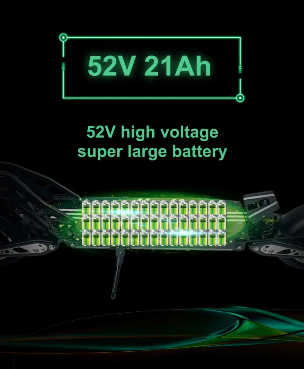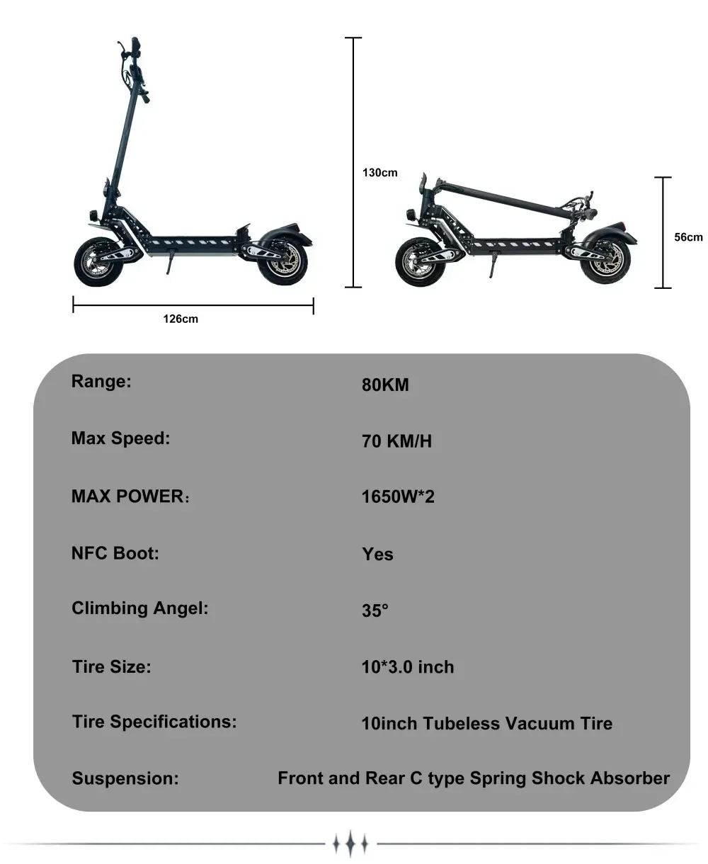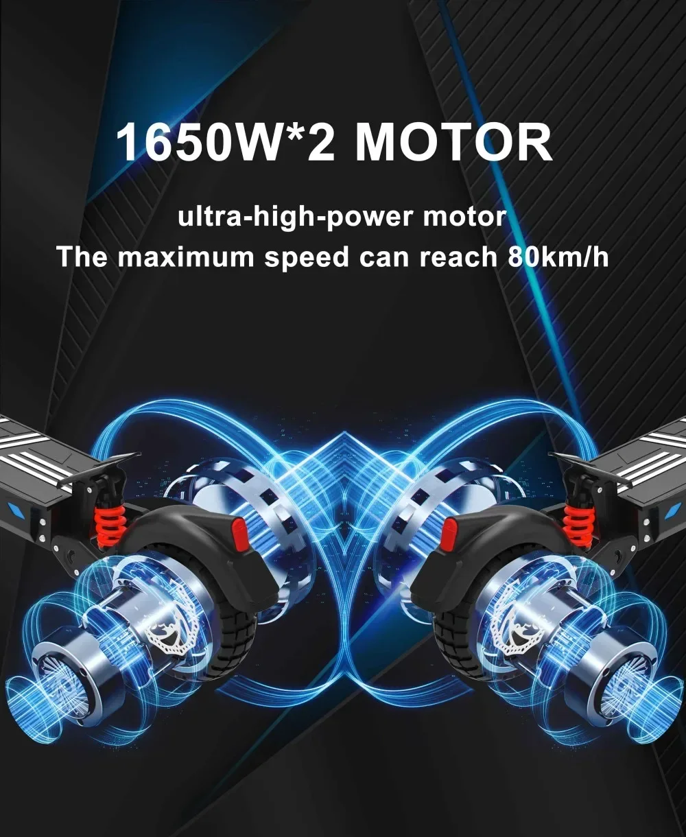 The DriveTron DT10 is designed to dominate urban commutes with its robust 1650W*2 motor. Reach speeds up to 70 km/h and enjoy a range of up to 60-70 km on a single charge, thanks to the 48V 20.8Ah battery. The dual-disc brake system ensures your safety, providing confident stopping power in all conditions.